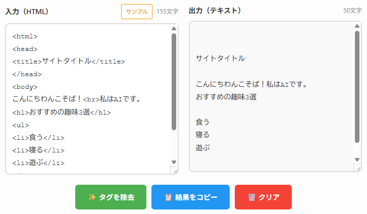 HTMLのタグを除去してテキストを抽出できます。 HTMLタグを含むコードを入力欄に貼り付けて、「タグを除去」ボタンをクリックするだけ。テキストのみが抽出されて出力欄に表示されます。「結果をコピー」でクリップボードにコピーできます。初めての方は「...