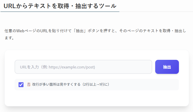 任意のWebページのURLを貼り付けて「抽出」ボタンを押すと、そのページのテキストを取得・抽出します。